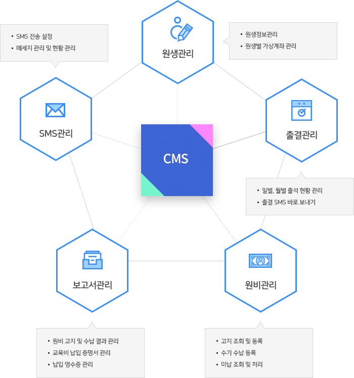 고지서 출력부 원생 전용 입금계좌를 통한 수납관리까지 학원에서 발생되는 모든 비용에 대한 자금관리서비스 뿐만 아니라 원생관리, 출결관리, SMS 전송 등 학원 운영에 필요한 다양한 기능을 통합ㆍ지원하는 학원전용서비스입니다.